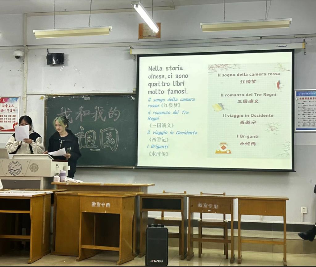 为了进一步加强爱国主义教育,将中国梦的核心牢记于心,同时将所学专业知识与热爱祖国联系在一起,并以多样的才艺迸发绚烂的色彩,太阳成集团122ccvip意大利语专业2301班全体同学于2024年10月22日在开发区综合楼406组织开展“我和我的祖国”系列才艺比拼。
