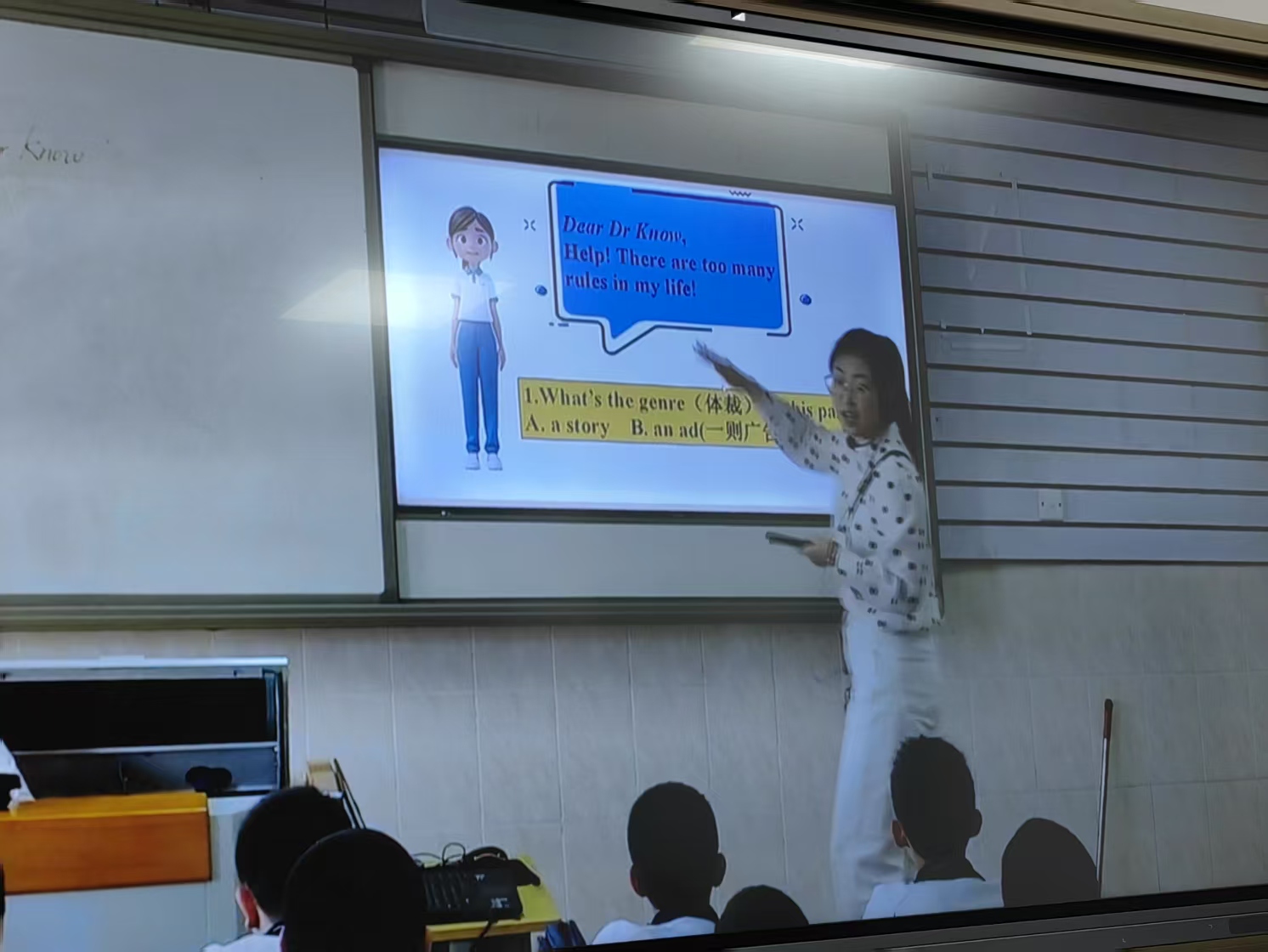 郑雨楠老师讲授的是七年级下册Unit2 No Rules, No Order Section B 1a-1c阅读课。在课程讲授过程中,郑雨楠老师利用数字人技术作为教学的主线,使阅读文本中的Dr. Know跳脱出课本,激发员工的学习兴趣,带领员工对阅读文本进行探索。