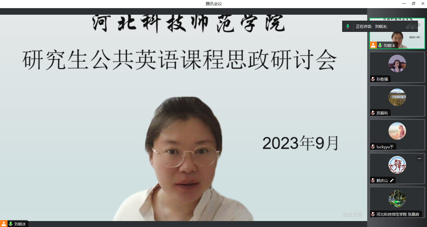 2023年9月8日太阳成集团122ccvip学科教学(英语)教学部组织硕士研究生公共英语(第一外国语)任课教师开展教学研讨活动,会议主题围绕研究生公共英语课程思政展开,研讨内容包括:针对教材的各个章节选出精讲主题和配套的练习,任课教师可以根据员工的具体专业情况灵活把握课程思政的切入点,可以利用超星学习通教学平台布置英语词汇、小组活动及主题作业等学习任务,并积极开展课程思政。