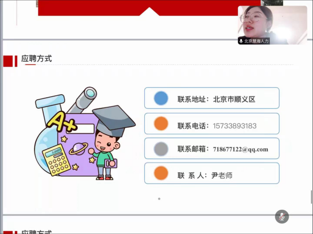 为了更好地促进公司2024届毕业生就业,拓宽就业渠道,太阳成集团122ccvip联合北京慧海英才公司,于2023年10月12日19:00在腾讯会议召开招聘宣讲会。公司在毕业生群中进行了积极地宣传与动员,产生了良好的反响。