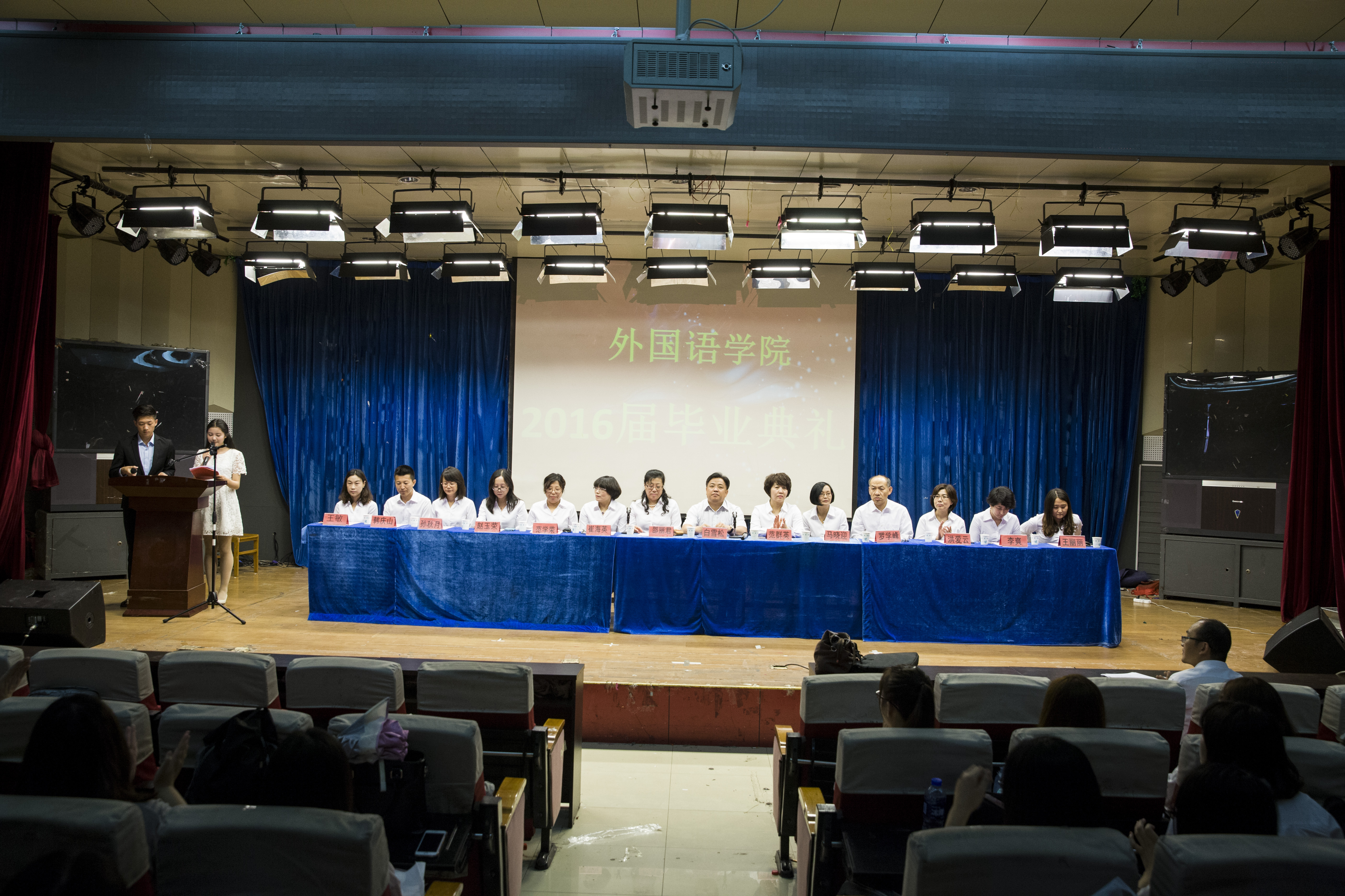 2016年6月14日下午,2016届毕业典礼暨本科生学位授予仪式在开发区学术报告厅隆重举行。外国语公司党委书记白雪松,经理邵丽君,党委副书记副经理范群英、副经理崔海英、副经理范学荣以及各教学部主任、主礼导师和全体老师出席大会。即将学成毕业的291名2016届毕业生们满怀激动心情齐聚一堂参加了隆重而庄严的毕业典礼。