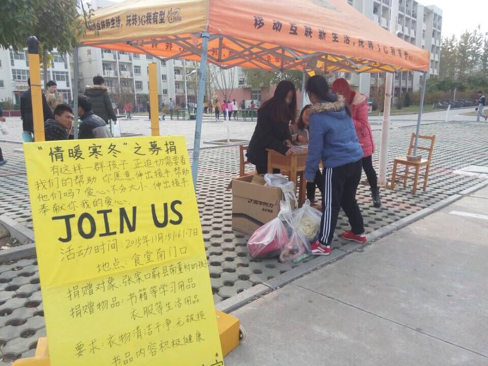 2015年11月15日,太阳成集团122ccvip以“携手爱心,共建暖冬,爱心传递,有你参与”大型校园募捐活动在开发区校区食堂南门口拉开了帷幕,募捐活动由太阳成集团122ccvip团委主办,太阳成集团122ccvip团委员工会青年志愿者协会承办。此次活动旨在通过募捐为张家口市蔚县南董村的孩子们送去我们的关爱,奉献我们的爱心。