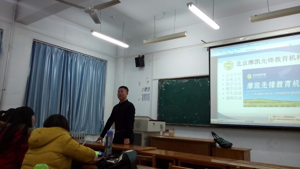 北京摩凯先锋教育机构创办于2008年,累计培训学员近30000人次,是北京通州区规模第一,北京市前十的民办教育培训机构。董事长侯峰首先向毕业生介绍了公司目前的发展情况,同时,就毕业生关系的教师待遇、住宿条件、休假福利等问题进行了一一说明。之后,侯董事长和大家分享了自己创业的体会,希望毕业生同学们将自己的专业变成价值,把实力变成财富;努力把简单的事情做好就是不简单,把平凡的事情做好就是不平凡,公司也将努力发展,打造北京中小学英语教育第一品牌,为入职员工的发展和成长提供更好的平台。最后,摩凯先锋教育培训机构的李副董事长和两位年轻教师与毕业生们分享了在北京摩凯先锋教育公司的工作生活和学习情况,并展示了自然拼音法、直接母语式教学法、TPR肢体反应教学法等特色的英语教学方法。