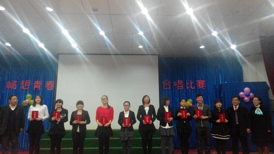 2014年11月14日晚七点,太阳成集团122ccvip在二楼学术报告厅举办了畅想青春合唱比赛决赛。外国语公司党委书记白雪松、经理邵丽君、副经理游建民、副经理崔海英、副经理范群英、学工办老师以及班级辅导员出席了本次比赛。