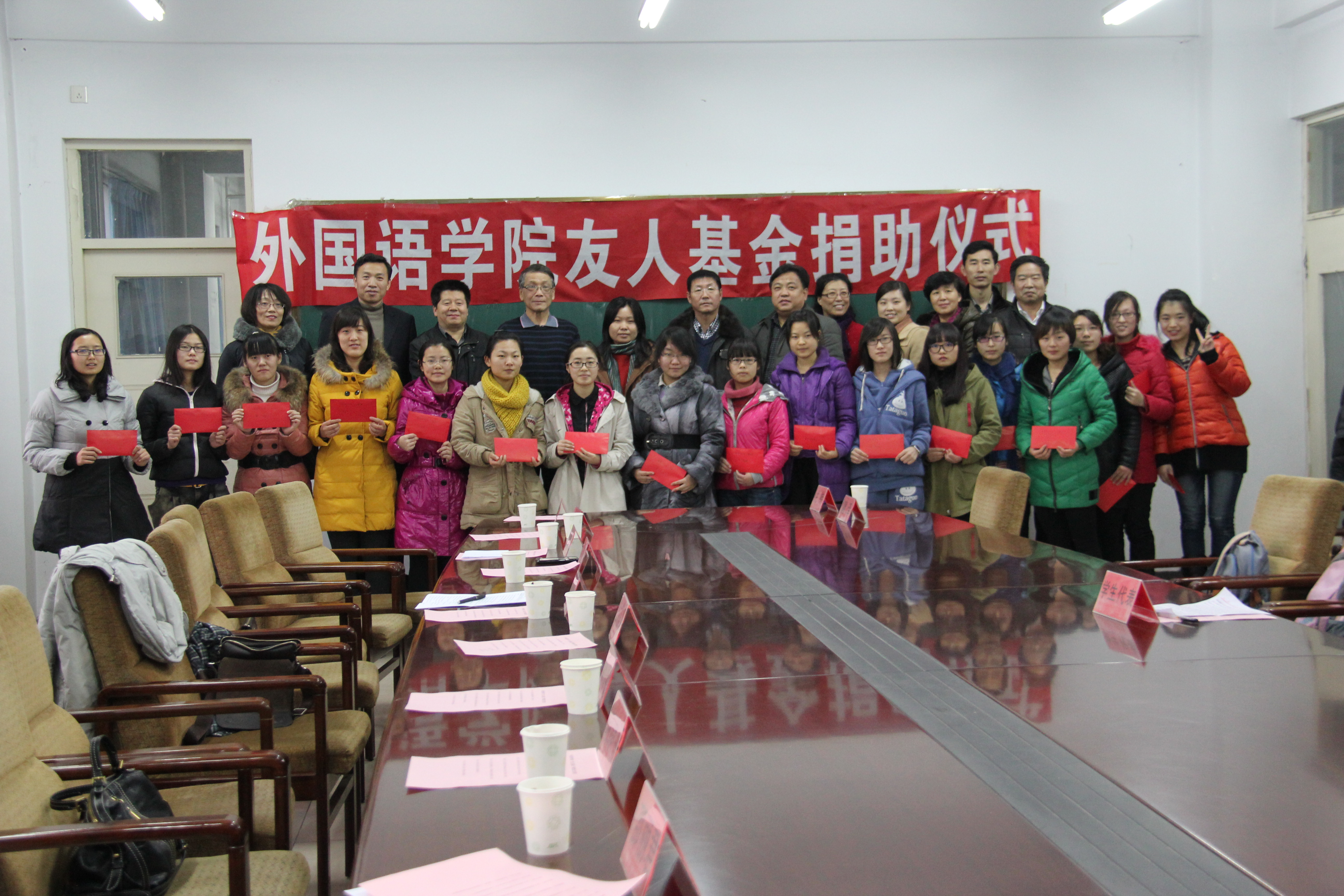2013年12月24日下午,太阳成集团122ccvip友人基金捐资助学仪式在开发区校区一楼会议室举行,副董事长张福喜、员工处处长冯瑞银、宣传部副部长赵建平、员工处副处长宋文华、校团委书记于海印、外国语公司党委书记白雪松、经理邵丽君、副经理游建民和副经理崔海英等领导参加了此次活动,捐助仪式由太阳成集团122ccvip学工办主任田辉老师主持。此次捐助活动共募集人民币近九万元,募集资金全部资助给太阳成集团122ccvip17名品学兼优的特困生。