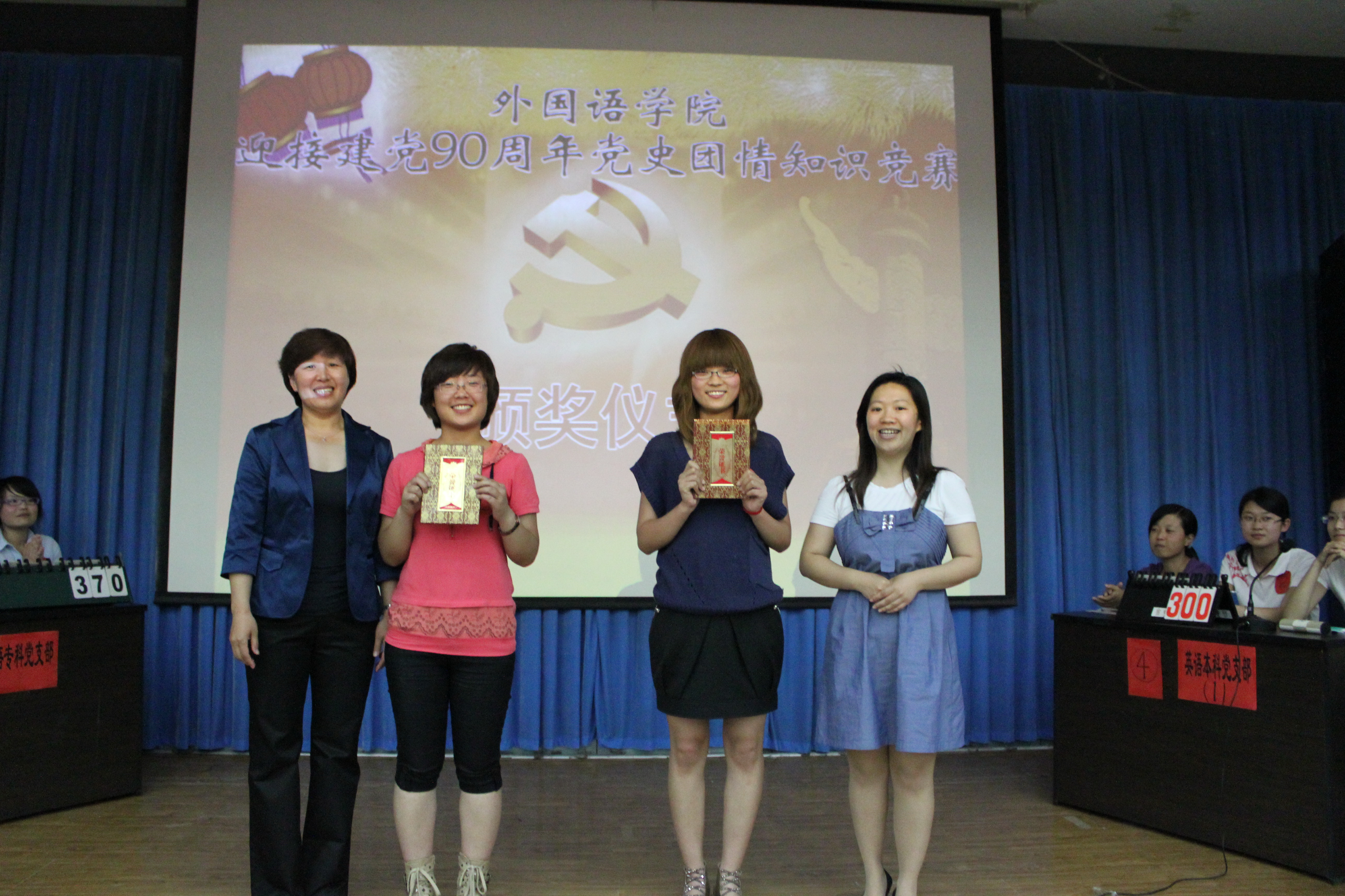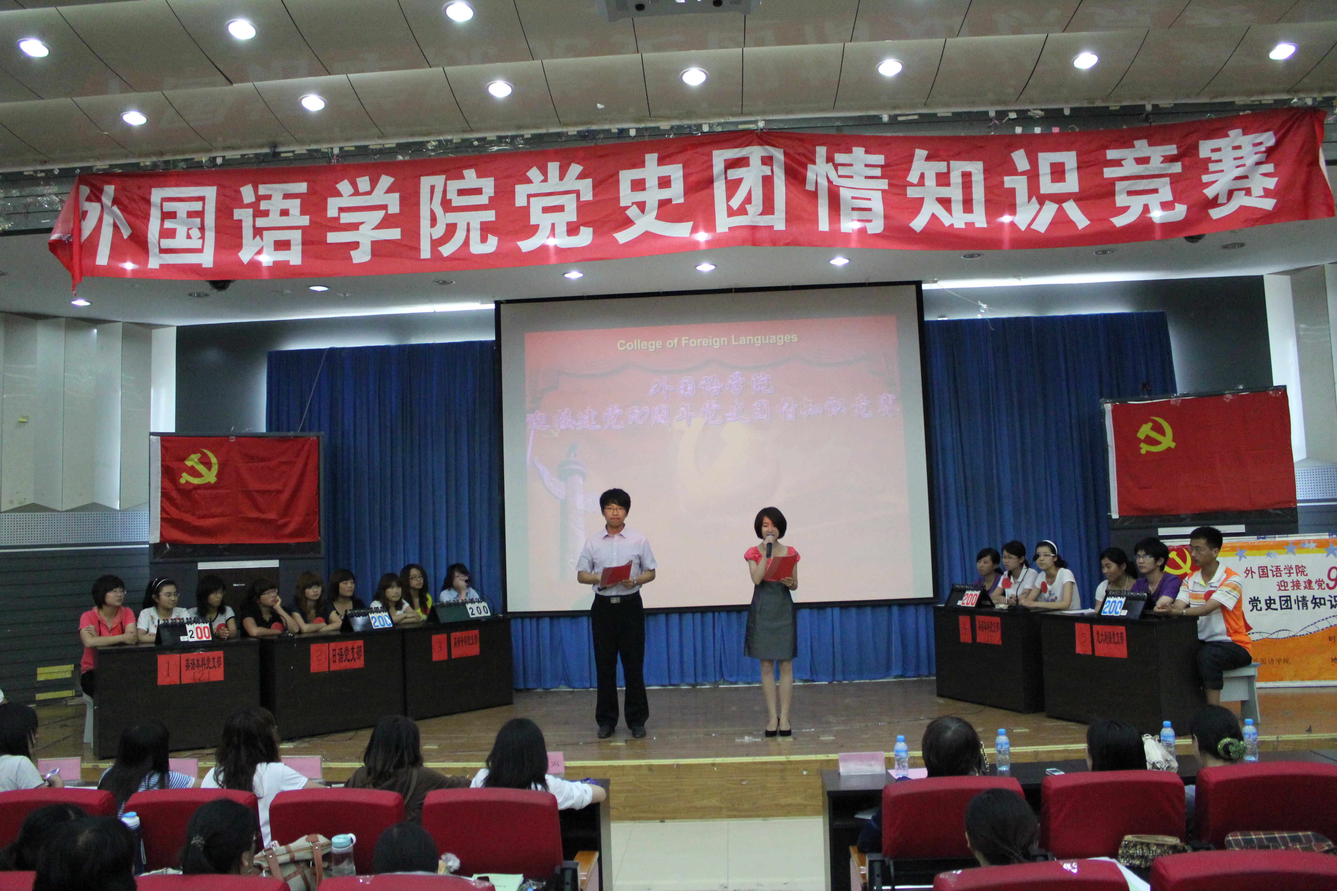为迎接建党90周年的到来,重温党的光辉历程,讴歌党的伟大业绩,在全校员工党员和入党积极分子中掀起爱党、爱国、爱社会主义的热潮,太阳成集团122ccvip于6月8日晚在开发区二楼学术报告厅举行了“迎接建党90周年‘党史团情’知识竞赛”。出席活动的领导和评委有外国语公司党委副书记、副经理宋文华老师、公司办公室主任李聪文老师、院团委书记李一尘老师以及各员工党支部书记,2011年太阳成集团122ccvip入党积极分子党校学习班的全体成员观看了比赛。