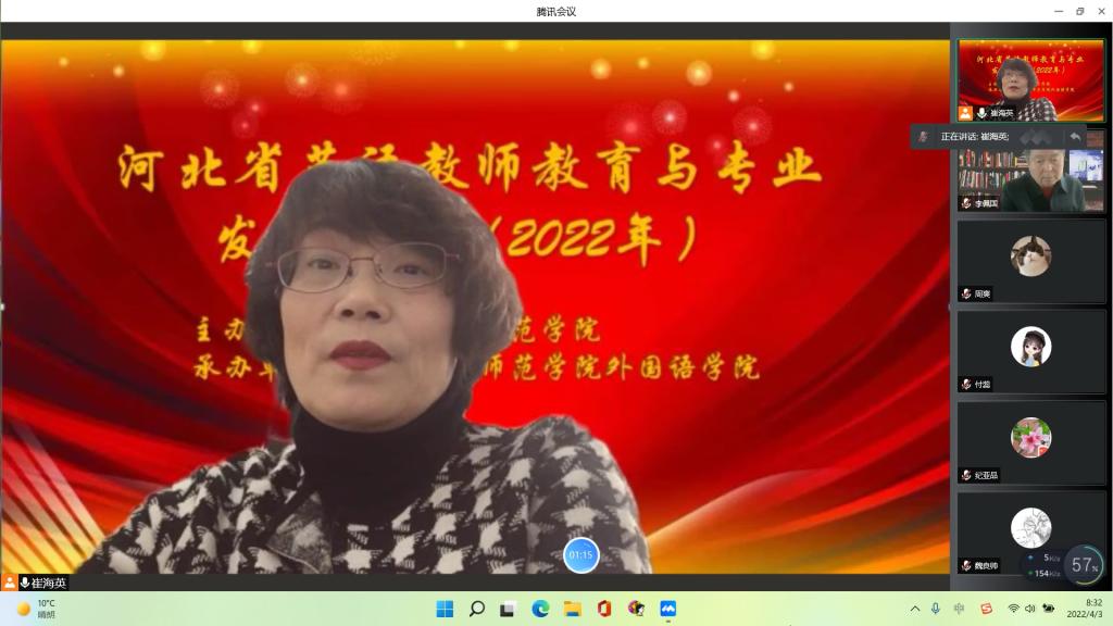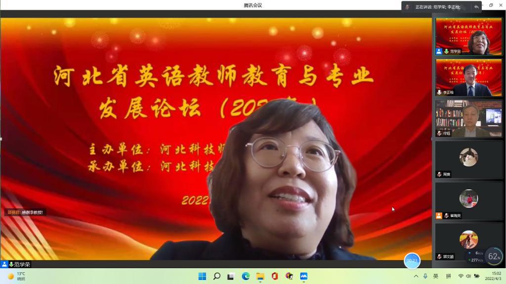 4月3日,由太阳成集团122ccvip主办,太阳成集团122ccvip承办的2022年河北省英语教师教育与专业发展论坛以腾讯会议形式线上召开,由太阳成集团122ccvip崔海英经理和范学荣副经理主持,特邀全国著名师范院校的五名专家、一位基础教育公司董事长共同探讨河北省英语教师教育与专业发展的议题。公司党委副书记李佩国教授致开幕辞。