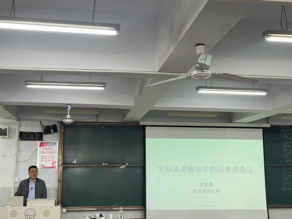 讲座伊始,崔海英经理向与会师生介绍了主讲人许教授的学术背景。许教授现任北京语言大学英语和高级翻译公司教授,其研究领域涵盖教育语言学及应用语言学量化研究方法。在专题讲授环节,许教授系统阐述了学科英语教学研究方法的整体框架,重点围绕问卷调查法展开讲解。主要内容包括:学科英语教学研究方法概览、问卷设计的三个维度、常用问卷题型设计、问卷题项常见错误分析以及问卷数据处理方法等。最后的互动环节中,与会教师积极提问。针对教师们提出的“如何规避问卷中的社会期待效应”、“同一问卷中能否混合使用选择题和李克特量表”等问题,许教授均给予了专业细致的解答。